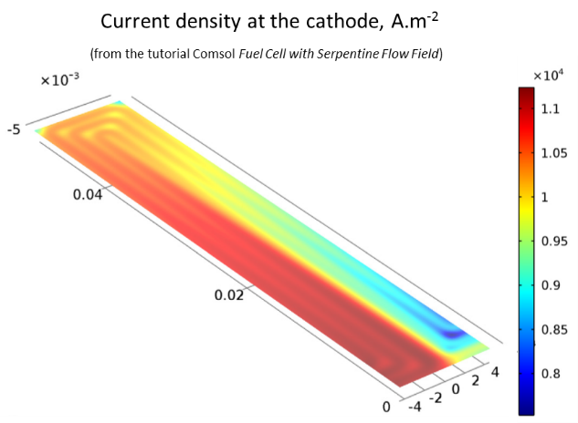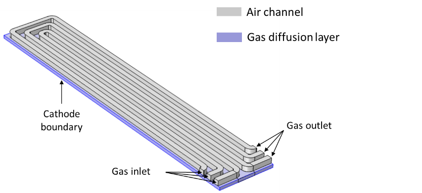 Oxygen is generally provided to the cathode of a fuel cell by means of serpentine-shaped channels. From this channel, the gas goes through a porous diffusion to finally get in contact with the cathode where it reacts to form water. The design of the serpentine pattern governs the fuel utilization, the current distribution and the pressure drop in the cell.