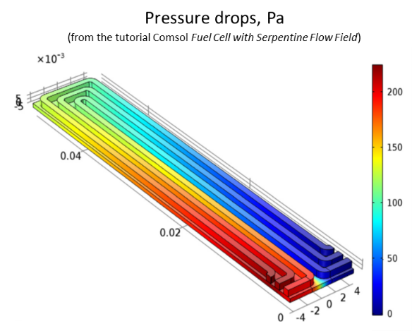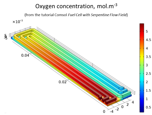 To ensure confidentiality, the present example is not a real client case. It is has been inspired from a Comsol tutorial. It describes the cathode air flow in a serpentine made of 3 channels and in the underlying diffusion layer. The objectives are as follows :