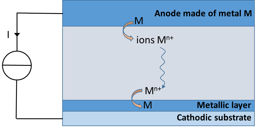 Electrodeposition is an electrochemical process in which a metal layer is deposited on a substrate. There are numerous applications of this process from a simple aesthetic layer to a functional material used, for example, in electrical circuits. The electrochemical cell is comprised of a cathode (substrate), an anode made of the metal to be deposited and the electrolytic solution with the metallic ions. When a current is prescribed, the metal which constitutes the anode is oxidized into ions in the electrolyte. These ions migrate toward the cathode where they are reduced back into a metal, forming the layer (see illustration). The main requirement is to obtain a layer with the most uniform thickness possible.