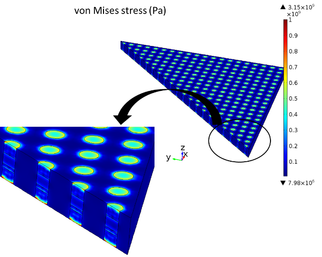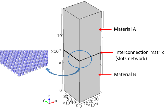 This case study is dedicated to the calculation of the thermomechanical stress and strain expected after the assembly of an interconnection matrix with micrometric dimensions. The system studied is composed of two materials, A and B, connected by cylindrical slots lattice, as depicted in the following figure.