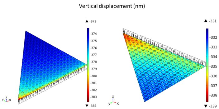 The vertical displacements of the structure induced by the shrinking of materials are computed on the interface between slots and material A or B. It can be noted that the displacement is quite homogeneous over the entire plane. Deviation between maximum and minimum displacement will determine the propensity of the assembly to break.