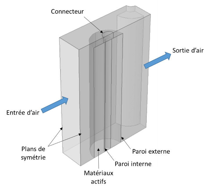 Cet exemple, repris d’un tutoriel COMSOL Multiphysics® du module Batteries and Fuel Cells, est consacré à la simulation du chauffage d’un élément Li-ion cylindrique compris dans un pack batterie et soumis à un flux d’air laminaire, lors d’un cyclage charge/décharge. Il s’agit d’un modèle 3D décrivant un motif élémentaire du pack avec les éléments suivants :