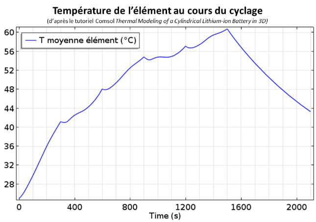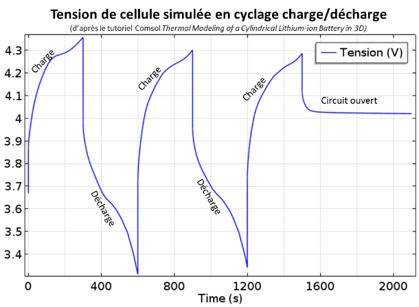 - La tension de cellule obtenue par le modèle électrique 1D est tracée en fonction du temps pour tous les cycles charge/décharge : réponse typique d’un accumulateur Li-ion.