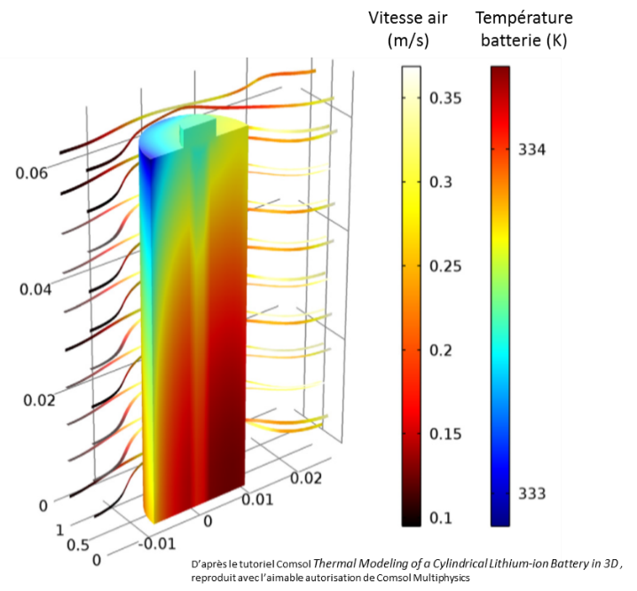 - La thermique est calculée, dans le modèle 3D, avec une source de chaleur volumique définie dans les matériaux actifs et associée aux pertes Joule et aux surtensions calculées dans le modèle électrique 1D. La chaleur est transportée par conduction dans les matériaux de batterie et par convection dans l’air.