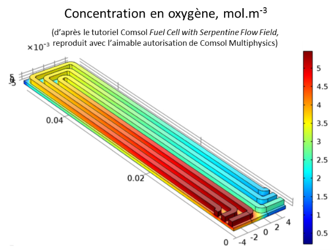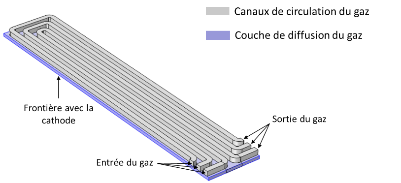 L’oxygène est souvent apporté à la cathode d’une pile à combustible par l’intermédiaire d’un circuit en serpentin. A partir de ce canal, le gaz passe à travers une couche de diffusion poreuse avant d’entrer en contact avec la cathode où il réagit pour former de l’eau. Le design du serpentin conditionne la bonne circulation du gaz, notamment les pertes de charges, et de manière indirecte le bon fonctionnement du système (rendement).