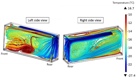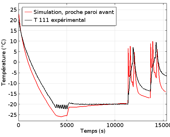 L'étude a consisté à développer un modèle de mécanique des fluides turbulente couplé avec des échanges thermiques (convection naturelle et forcée) sous COMSOL Multiphysics®. Différents modèles de turbulence ont été étudiés pour retenir celui donnant les meilleurs résultats, en comparaison avec résultats expérimentaux. Ces modèles ont été validés dans plusieurs configurations différentes, simulant les conditions réelles auxquelles sont soumises les camions (alternance ouverture/fermeture de la porte arrière).