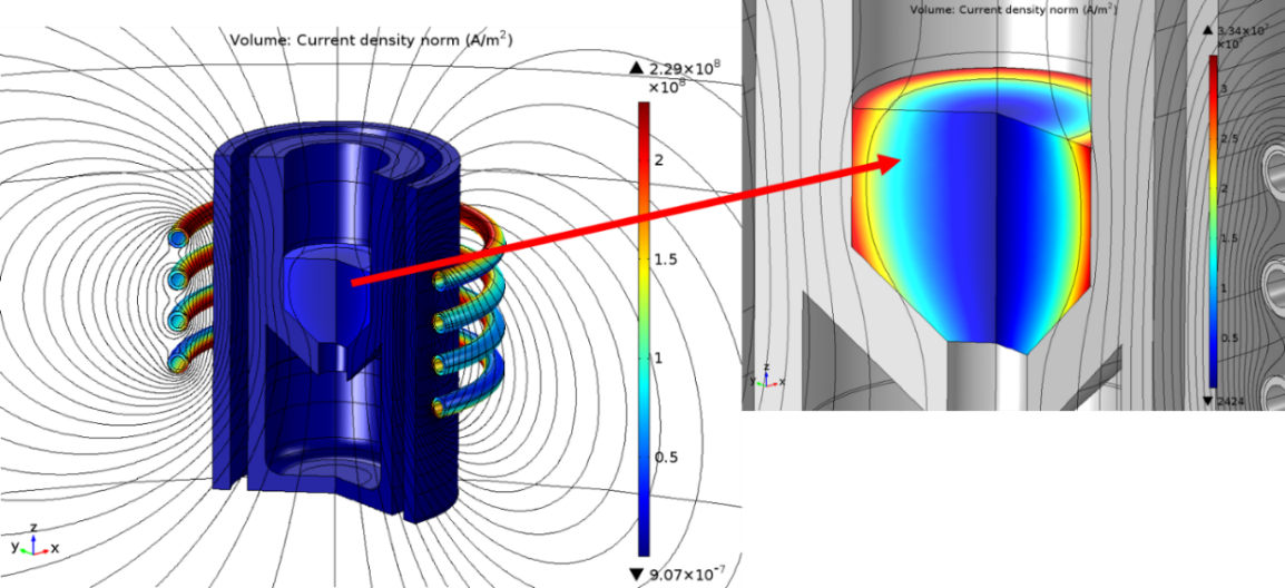 Pour des raisons de confidentialité, on illustre le type de résultats obtenus par simulation sur un modèle simplifié, constitué d’un inducteur de 4 spires refroidies à l’eau, un écran thermique en céramique, un creuset en graphite et une charge en acier. Un générateur fournit la puissance électrique à l’inducteur via un courant alternatif. Un champ magnétique variable est ainsi généré, induisant des courants dans les éléments conducteurs environnants, représentés ci-après :