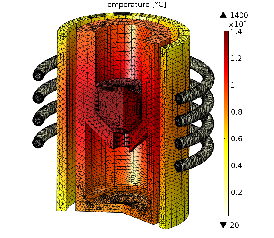 De par sa capacité à chauffer efficacement et rapidement une charge à distance, le chauffage par induction offre une solution technologique à de nombreux problèmes industriels. On s’intéresse ici à la modélisation d’un four à induction permettant de fondre une charge supportée par un creuset. La modélisation du procédé permet de décrire le champ de température et la répartition dans chaque composant du four. La société SIMTEC répond à différents besoins de ses clients tels que :