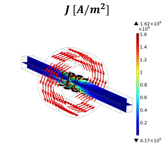 La modélisation de ce problème couplé électromagnétique/thermique a été effectuée sous COMSOL Multiphysics®. Les plans de symétrie du lopin sont utilisés pour résoudre le problème thermique. Les courants induits dans le lopin d’acier sont représentés pour une fréquence donnée ainsi que le champ de température résultant :
