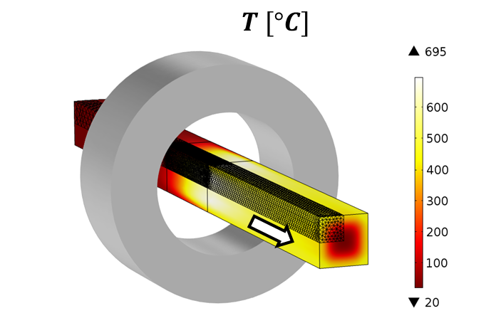 Compte tenu de l’effet de peau, plus la fréquence du courant est élevée, plus le courant circule en surface. SIMTEC a réalisé des études paramétriques sur la fréquence et les propriétés électriques pour obtenir différentes répartitions de température dans le lopin. Ainsi, nous avons été capables de proposer dessolutions technologiques respectant les contraintes du client.