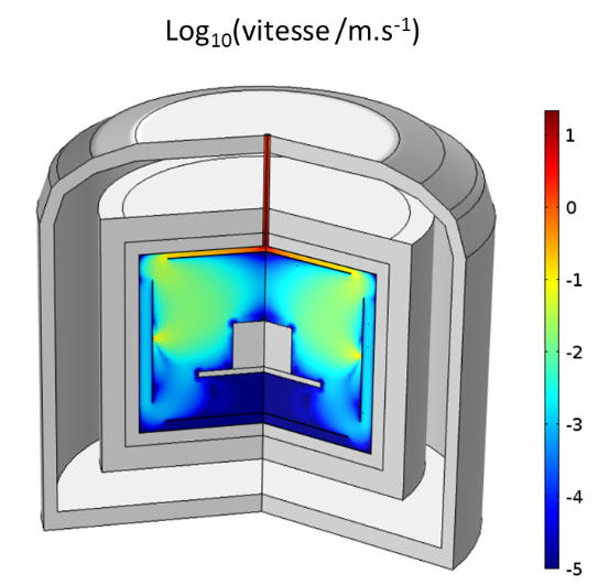 - Le champ de vitesse associée à la convection forcée du gaz dans l’enceinte. La convection est surtout significative dans la partie supérieure, autour de la charge.