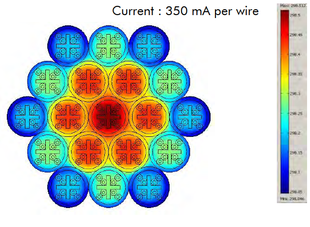 Après validation du modèle, de nombreuses configurations géométriques de bundle ont pu être étudiées. Cette étude à permis de déterminer le design optimal faisant passer la plus grande intensité électrique possible tout en maintenant la température sous le seuil critique.