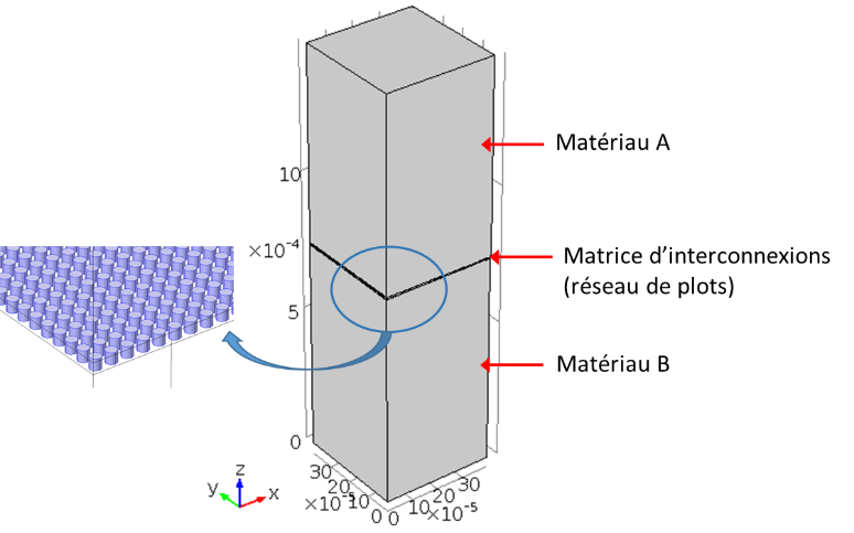 Ce cas d’étude se propose de déterminer les contraintes et les déformations thermomécaniques attendues après la mise en forme d’une matrice d’interconnexions électronique dont les dimensions sont micrométriques. Le système étudié est constitué de deux matériaux A et B connectés entre eux par un réseau de plots cylindriques, comme indiqué sur la figure ci-dessous.
