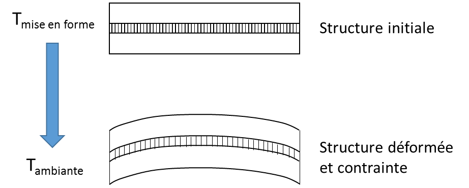 Schéma des assemblages de matériaux étudiés et effet de la variation de température sur la forme de la structure.