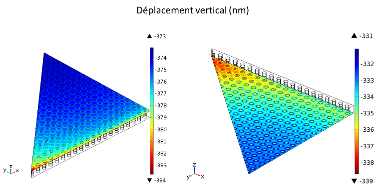 Les déplacements verticaux subits par la structure du fait de la rétractation des matériaux. Ceux-ci sont calculés dans le plan des interfaces entre les plots et les matériaux A et B. On note un déplacement assez homogène des interfaces. L’écart entre le déplacement maximal et minimal (la flèche) déterminera la propension de l’assemblage à rompre.