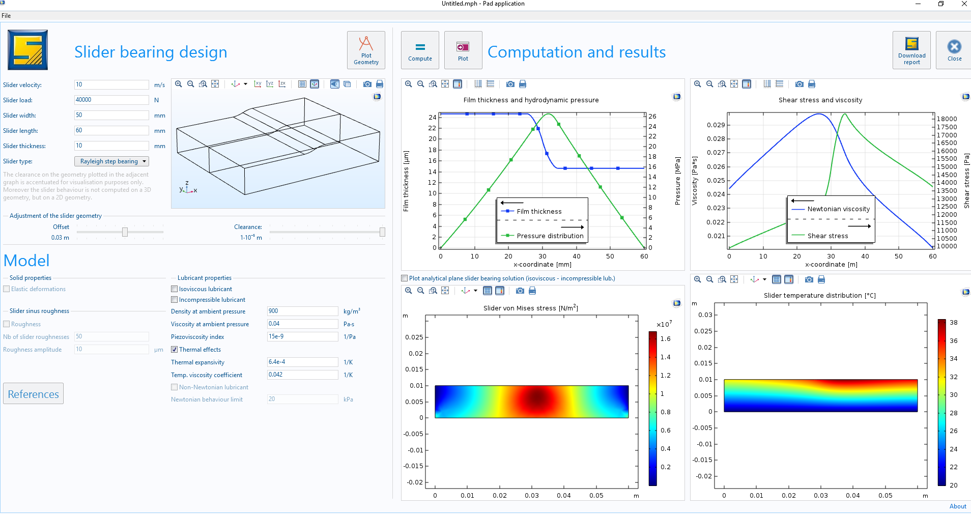 Pour résoudre ce problème, SIMTEC a décidé de rendre plus accessible un modèle autrement réservé à des experts des méthodes numériques appliquées à la tribologie. Au sein d’une interface conviviale, l’utilisateur peut configurer un patin lubrifié, ses conditions opératoires et les propriétés du lubrifiant afin de pouvoir prédire son comportement.