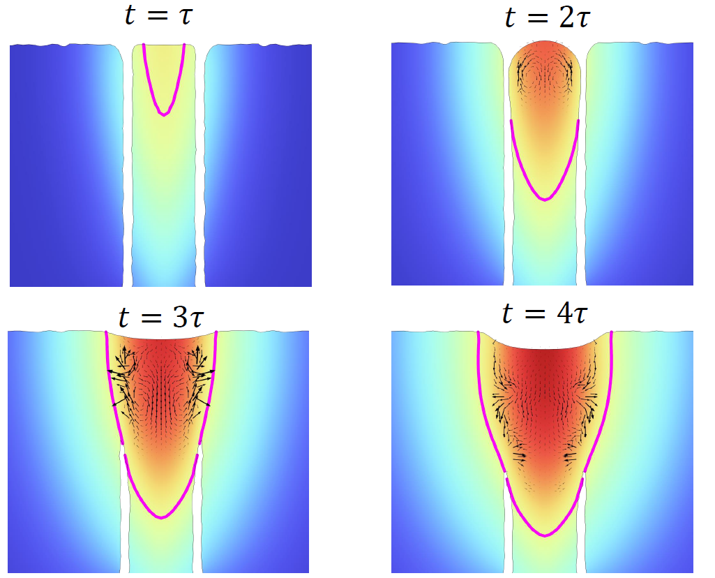 Le procédé de soudage par laser impulsionnel permet d'assembler des pièces métalliques par une succession d’impacts, produisant chacun une fusion localisée de la matière. À la fin de l’impact laser, les phases de remplissage du capillaire et de solidification du métal liquide se succèdent. Des bulles de gaz emprisonnées dans le bain de soudage peuvent alors conduire à la formation de porosités. Afin d’améliorer notre compréhension du lien entre les propriétés thermophysiques des métaux et les risques de formation des défauts, un modèle numérique reliant les caractéristiques géométriques du bain fondu et la durée de remontée des bulles de gaz a été élaboré au sein du code COMSOL. Ce modèle se borne à représenter les phénomènes physiques après l’arrêt du faisceau laser, une fois le capillaire de soudage rempli. Le calcul prend en compte la remontée des bulles sous l’effet de la poussée d’Archimède, l’influence de la tension de surface, et l’avancée du front de solidification liée au refroidissement (calcul thermohydraulique couplé). Des calculs ont été menés pour deux matériaux, le tantale et l’alliage de titane TA6V, pour différentes tailles initiales de bulles.