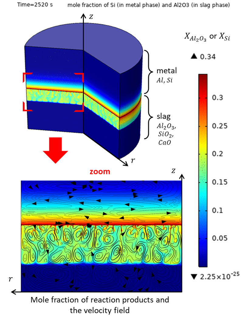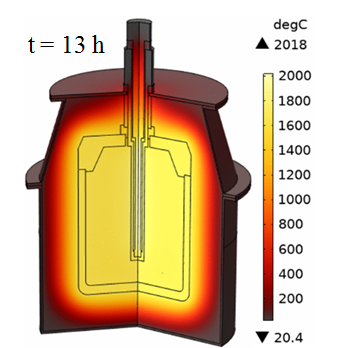 Present work is done in the framework of the SisAl Pilot EU project, which aims at optimising the silicon production in Europe by recycling materials and using a carbon-emission friendly technology. The silicon production experiments are conducted on laboratory and pilot scales in different types of furnaces, including top-blown rotary converters (TBRC) used as chemical reactors for molten slag-metal mixtures. Besides experimental work, the process optimisation also relies on the numerical modelling. In this work COMSOL Multiphysics® is used for the numerical testing of a new thermal design of TBRC by simulating its preheating and charge heating in it due to an external heat source provided by an oxy-fuel burner. The risk of slag solidification in TBRC during aluminothermic reduction of silica was assessed. The following COMSOL® modules are employed: Heat Transfer in Solids and Fluids with phase change, Surface-to-Surface Radiation, and Turbulent Flow k-ω model to simulate the slag and metal flow. A bidirectional coupling of all the modules is present due to multiple interdependencies via material properties. The model predicts that, with 600 kW of the useful burner power, the empty TBRC can be preheated up to 1650°C in less than 30 min. Thanks to the model, the optimum burner power for maintaining the TBRC charge in a liquid state is determined. The influence of TBRC inclination angle as well as of its rotation frequency is studied numerically. The presented modelling approach for testing new TBRC designs can be applied to other similar thermal problems.