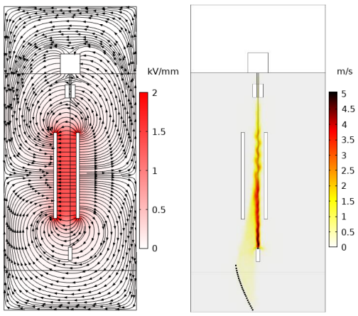 This new approach makes it possible to forecast phenomena of aeraulic aspiration followed by bouncing of the droplets by electrostatic repulsion, allowing a better understanding of the mechanisms and the design parameters playing on the printing quality.