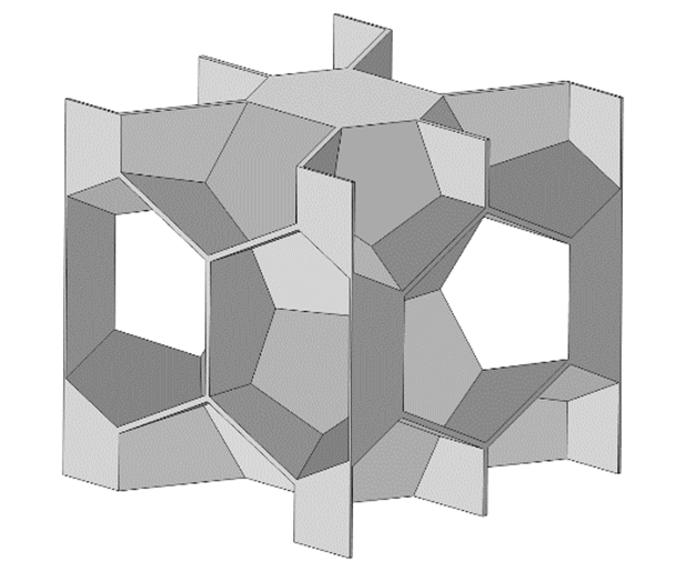 In this work, periodic homogenization as described in Viry et al. [1] is applied to investigate the foam properties. The foam unit cell selected is based on Weaire and Phelan solids [2] that represent a periodical structure very close to foam structure. Indeed, the Weaire and Phelan pair of solids show two import properties: together, (a) they map the 3D space, and at the time of the study, (b) they are the periodical volumes verifying (a) that show the minimal surface to volume ratio. This latter property is mimicking accurately the energy minimization process involved in cell shape forming process.