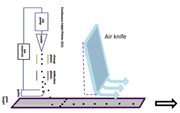 In the field of industrial marking, continuous inkjet technology is based on high speed emission of ink drops. The printing quality is directly linked to the interactions of the droplets with their environment during flight time: electric field, aerodynamic perturbations, and droplet-droplet interactions.